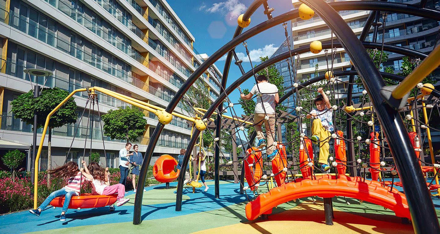 المشروع محاط بالمباني السكنية والمكاتب والفنادق والمجمع التعليمي والبازار الخارجي. تبلغ مساحة المساحات الخضراء 100،000 متر مربع.