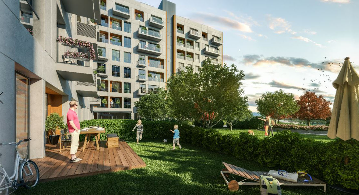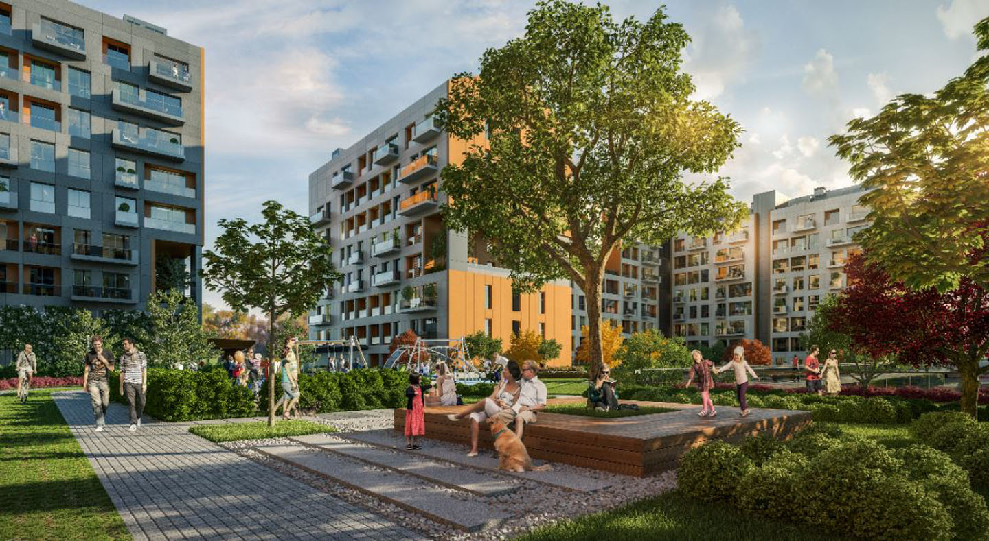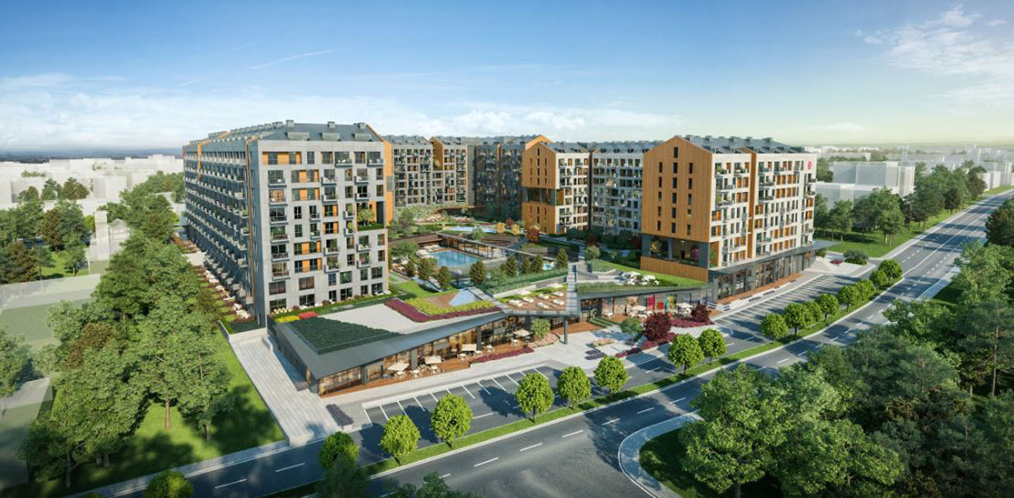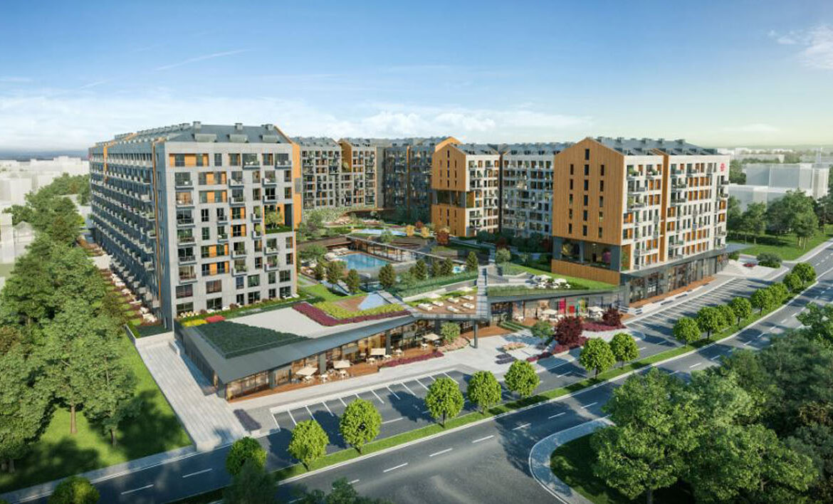 The project has been built in an area of 28,500    square meters, and green spaces make up the largest part of the project. The project consists of 3 blocks with 523 housing units and 45 shop
